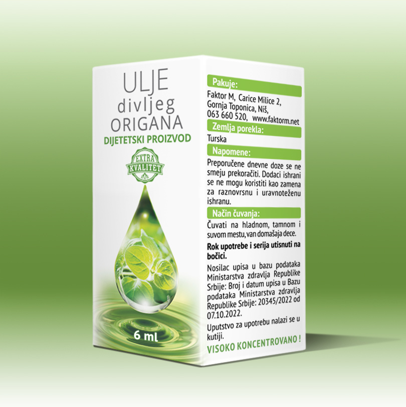 Ulje divljeg origana je registrovano u Ministarstvu zdravlja pod rednim brojem 20345 i potpuno je bezbedno za oralnu upotrebu. Upotrebom ovog ulja možete poboljšati svoje zdravlje i ojačati imunitet prirodnim putem. Pogodno je za korišćenje u aroma lampama i difuzerima.